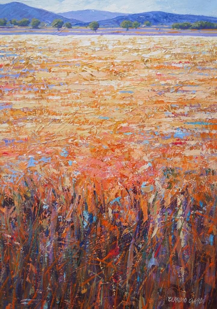 Claudio Ciardi, possiede la natura, identificandosi in essa ed il risultato finale è un rapporto d’amore.Un impegno che gli permette di compiere fino all’ultimo la sua educazione figurativa con purezza e senza mentire a se stesso. La sua tavolozza, impressionisticamente, è ricca di innumerevoli tonalità che arricchendo e completando l’ambiente lo esaltano in una dimensione vitale e luminosa. E’ con la naturale freschezza che il pittore trasforma le sue opere in veicolo emozionale. Di chi trae dal proprio cuore e dalla propria esperienza la parola della comunicazione.